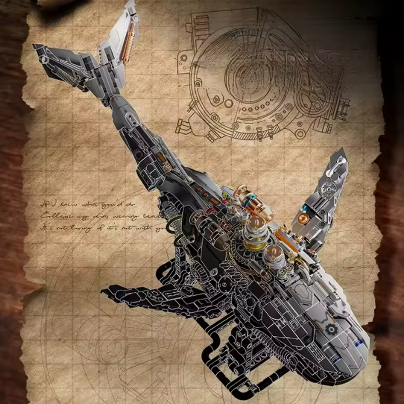 Mergulhe em uma experiência única de construção com a Baleia Mecânica - uma impressionante obra feita em plástico ABS de alta qualidade. Cada detalhe foi projetado para encantar: das engrenagens internas aos tubos metálicos que dão vida a essa criatura steampunk dos mares.