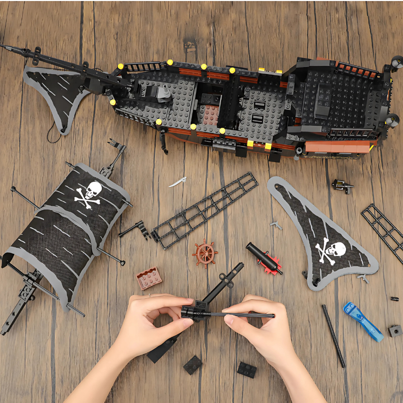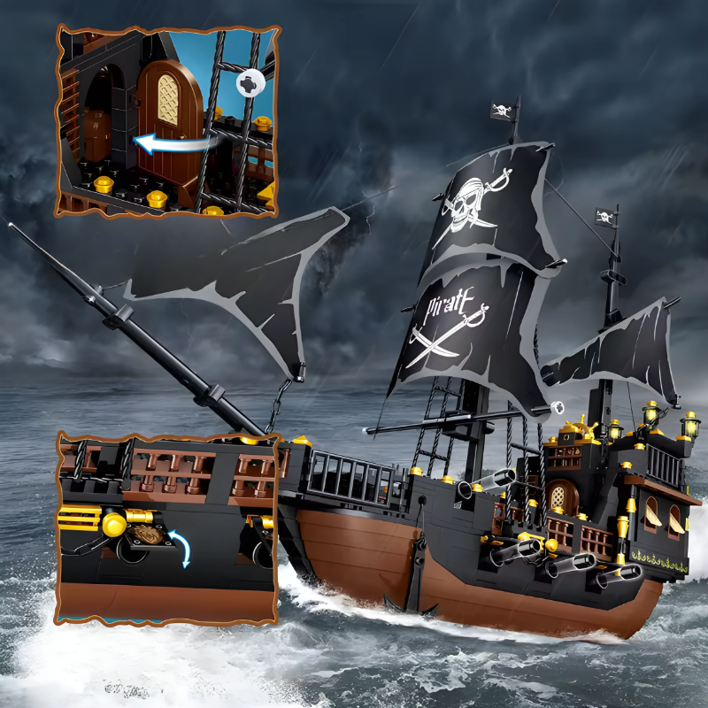 Com plástico ABS de alta qualidade, este navio pirata é uma verdadeira obra de arte em blocos de construção. Cada detalhe foi pensado para proporcionar uma experiência única, desde as velas imponentes com a clássica caveira até os canhões e a estrutura robusta que remete ao famoso navio dos sete mares.